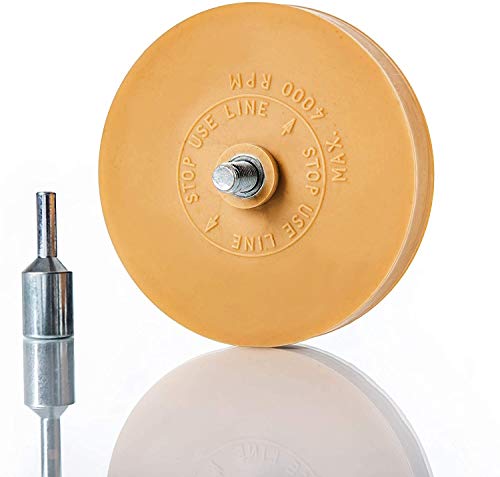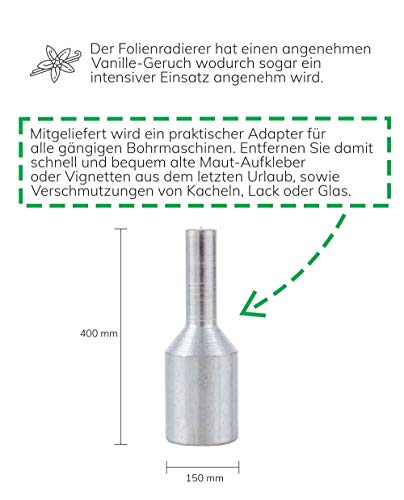 Geleverd wordt een praktische adapter voor alle gangbare boormachines. Verwijder hiermee snel en gemakkelijk oude tolstickers of vignetten uit de laatste vakantie, evenals vuil van tegels, lak of glas.