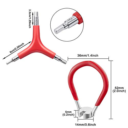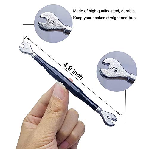 2 stuks 8 snijopeningsontwerp, geschikt voor spaken en tepelmaten variërend van 10/11/12/13/14G/15G; 1 stuk rode fietspaaksleutel, die 360 graden kan worden ingesteld, 1 zwarte fietspaak, 14G-15G, geschikt voor het aanspannen van spaken en correcte velgvervorming.
