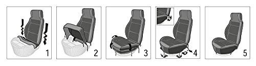 Montage: De bekleding wordt over de hoofdsteun getrokken en over de zitting gestreept. De geïntegreerde elastische band wordt onder de zitting stevig bevestigd.